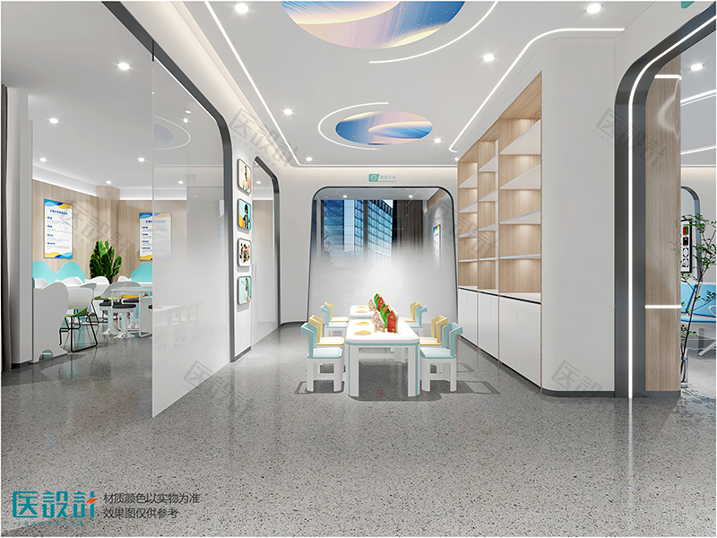 在视光眼科的装修中,医院白独有的稳定情绪的作用,决定了它总是作为背景色流转于空间之中,而蒂芙尼蓝的清新,带来鲜明的现代感,高级的感觉呼之欲出,加上原木风的墙面,演绎自然,温馨治愈。